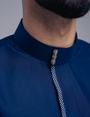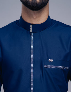 Simple, Elegant & Classy is the best way to describe this Thobe. A must have in your collection. Clean, Crisp Navy fabric with a set of matching Amaani Buttons on the Cuff, Collar and Top Pocket adds Subtle details to this Thobe that makes it stand out from the rest.